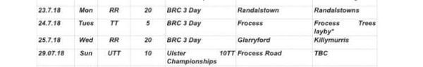 This coming weeks sees BRCs annual club 3 day event followed by the Ulster 10 mile TT Championships which are being hosted by our club on Sunday 29th July.